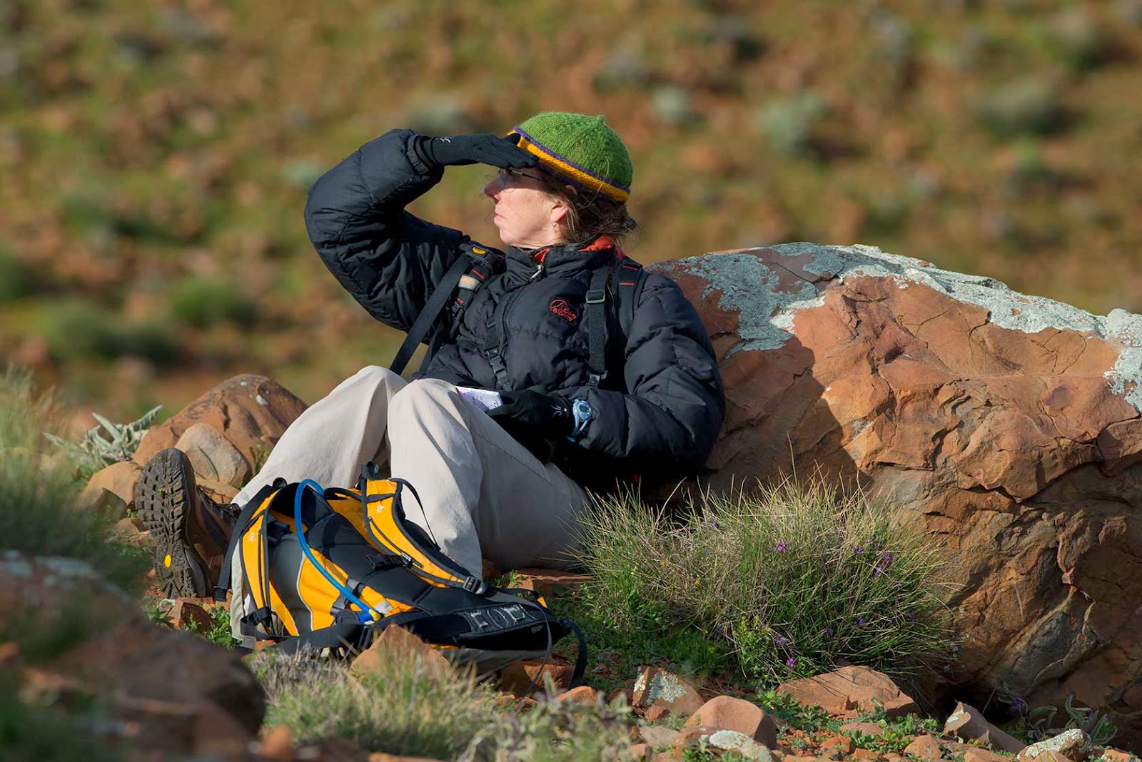High fashion in the desert includes a fly-headnet. There must have been a breeze at this point, the headnet is in place over the hat, ready to come out as needed.